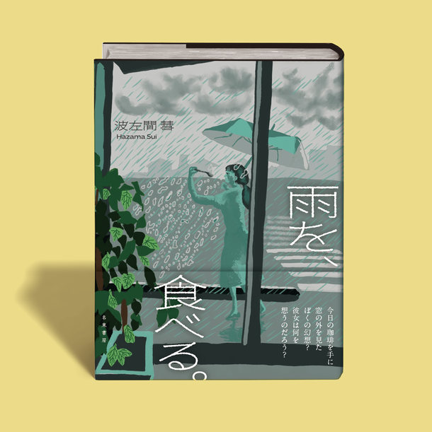 美術学校で絵を学んだ経験のない、「レ昇る」 さんの絵をSNSで偶然見つけて擬似装丁をつくってみました。雨天の暗い色彩、雲、雨粒の表現、消え入りそうで悲しげな青い女性の幻想的な姿は、北欧的な美も感じます。雨を食べるという発想も面白い。僕が装丁の仕事以外で、最も早く人に貢献できること、喜んでもらえるものってこういうことかもしれません。忙しくても絵を見た瞬間に「やってみよう」と手が動いてしまうんです。また機会があったらつくってみたいですね。偶然の出会いに感謝します。