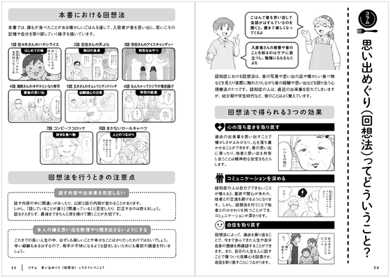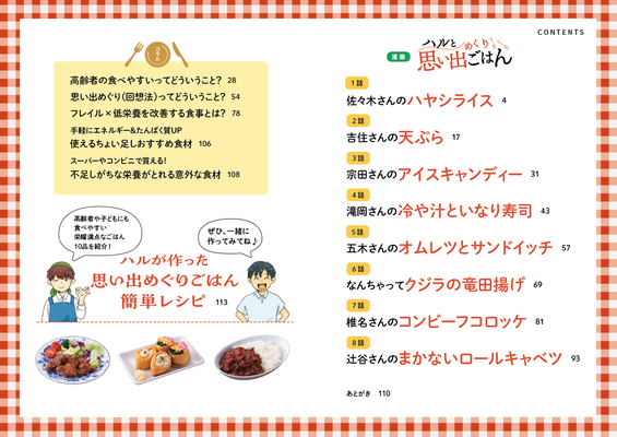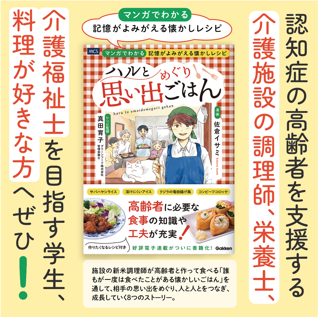 高齢者を支援する、介護施設の調理師や栄養士、介護福祉士を目指す学生、料理が好きな方へぜひ。認知症の高齢者施設に勤める新米調理師のハルが 「食」を通して思い出に寄り添いながら成長する心温まるストーリー。各漫画の「懐かしいごはん」は、カラーでレシピを掲載。食べやすい調理の工夫や食事の知識が満載です。管理栄養士監修のレシピやコラムで、高齢者に必要な栄養の知識や、噛む力や飲み込む力に合わせて食事を楽しめる「食べやすさの工夫」を詳しく解説。誤嚥を防ぎ、食欲を刺激するヒントを紹介します。