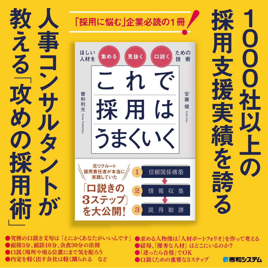 1,000社以上の採用支援実績を誇る人事コンサルタントが教える「集める」「見抜く」「口説く」ための「攻めの採用術」を大公開!「どんなに頑張っても、わが社には優秀な人材がぜんぜん来てくれない」「理想の人材を見つけ、一生懸命口説いても、結局逃げられてしまう」ーーご存じの通り、今の日本は未曽有の採用難時代。企業側にとって、採用市場はいまや「椅子取りゲーム」です。本書は、採用の厳しさを理解しつつもパラダイムシフトできていない会社が、自社よりも採用ブランド力や知名度がずっと高い競合他社に勝つにはどうすればいいのか。その手法とは、目の前にいる候補者に全精力を傾けて、必要な情報を提供し、「この会社に入社しよう」という入社動機を採用担当者と一緒に醸成する。そう、「口説く力」を高めることこそが、労力や費用や知名度に限界のある企業が採用上でできる最後の砦なのです。