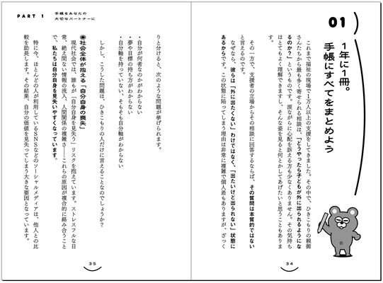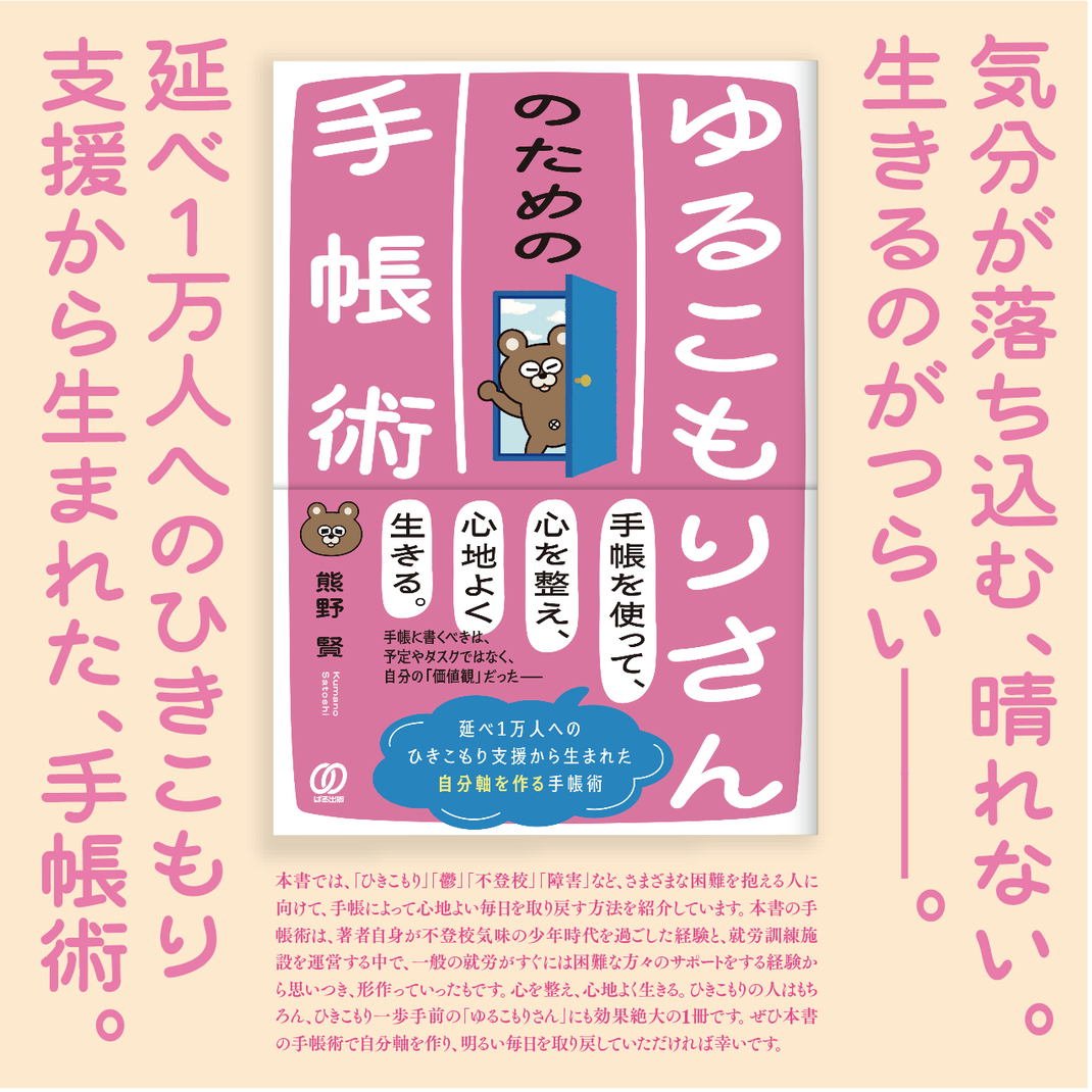 本書では、「ひきこもり」「鬱」「不登校」「障害」など、さまざまな困難を抱える人に向けて、手帳によって心地よい毎日を取り戻す方法を紹介しています。本書の手帳術は、著者自身が不登校気味の少年時代を過ごした経験と、就労訓練施設を運営する中で、一般の就労がすぐには困難な方々のサポートをする経験から思いつき、形作っていったもです。心を整え、心地よく生きる。ひきこもりの人はもちろん、ひきこもり一歩手前の「ゆるこもりさん」にも効果絶大の1冊です。ぜひ本書の手帳術で自分軸を作り、明るい毎日を取り戻していただければ幸いです。